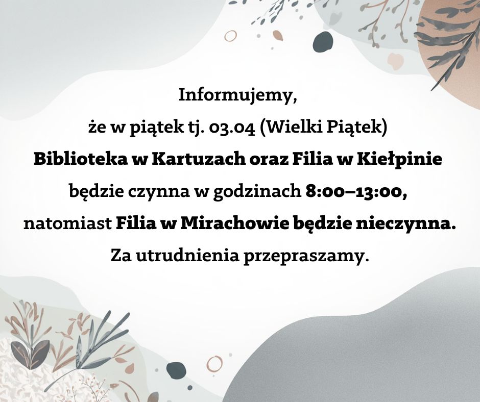Wypożyczalnia dla Dorosłych tel: 58 685 15 38, w.dorosli@biblioteka.kartuzy.pl